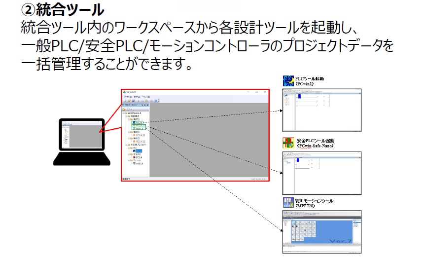 工作機械や設備において、設備を制御するPLC・安全PLC・操作画面・モーションコントローラを別々に設計していたものを、シームレスに設計できる設計・保守用ツールです。