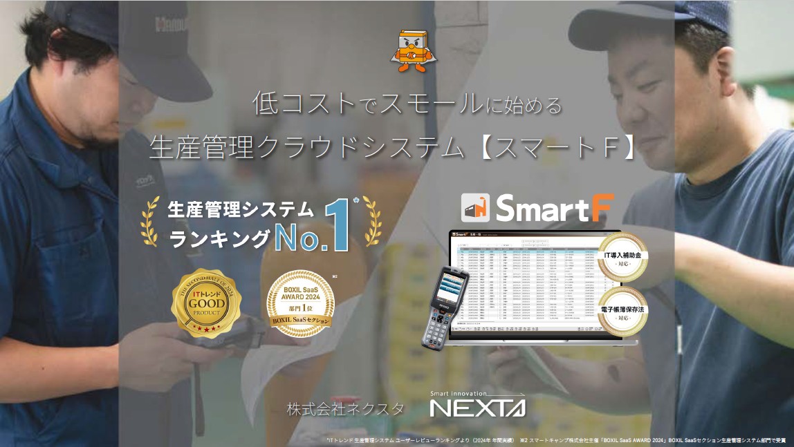 SmartFは、現場の“今”を見える化し、在庫・品質・原価をワンストップで管理するクラウド生産管理システムです。小さく始めて、大きく育てる──そんなスマートスタートが可能です。