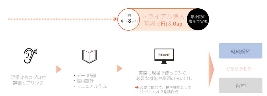 導入支援も手厚く、トライアル導入期間を設けて、お客様の専用マニュアル作成まで行います。