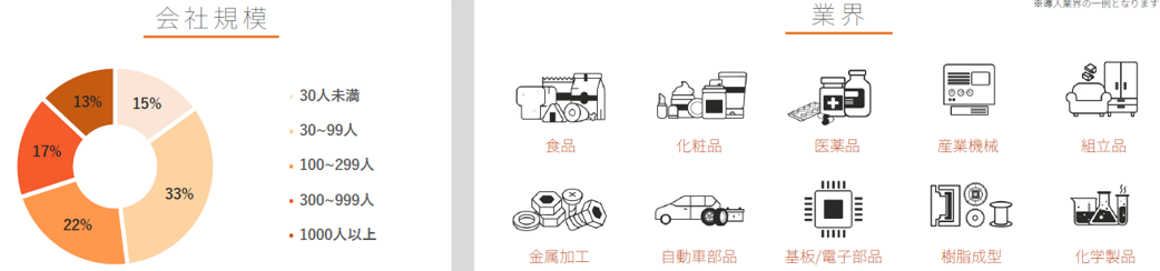 また、DX化が求められている「食品、化粧品、医薬品、産業機械、組立品、金属加工、自動車部品、基板/電子部品、樹脂成型、化学製品」と、様々な業界にて導入実績がございます!