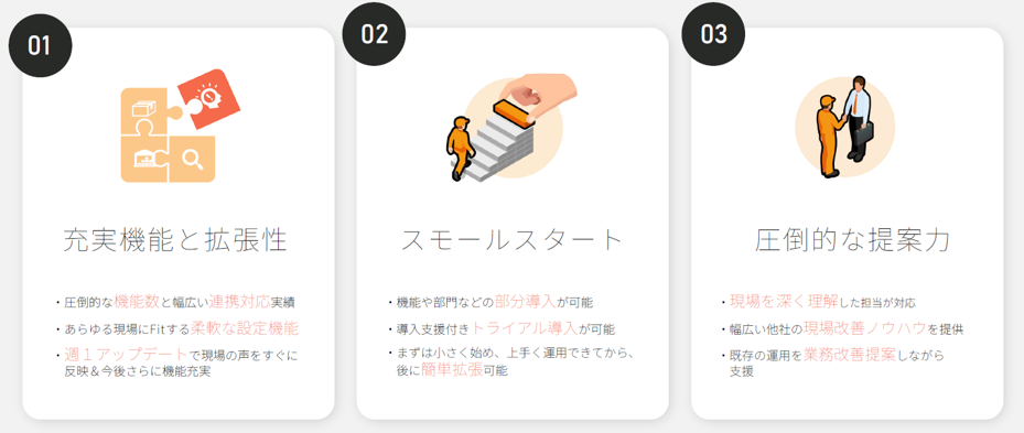 ①充実機能と拡張性…標準パッケージソフトのため、カスタムで組むシステムと違い、機能が充実しています。また、週1でアップデートされるため、一度導入していただくと、機能が日々よくなっていきます。